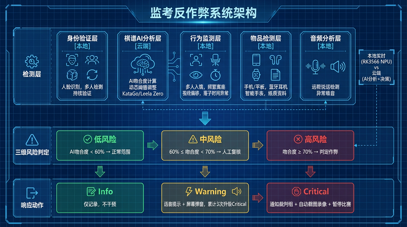 - 云端AI,本地监控:围棋AI引擎全自研、云端运行;本地低算力芯片专注实时视觉识别和行为监测类反作弊