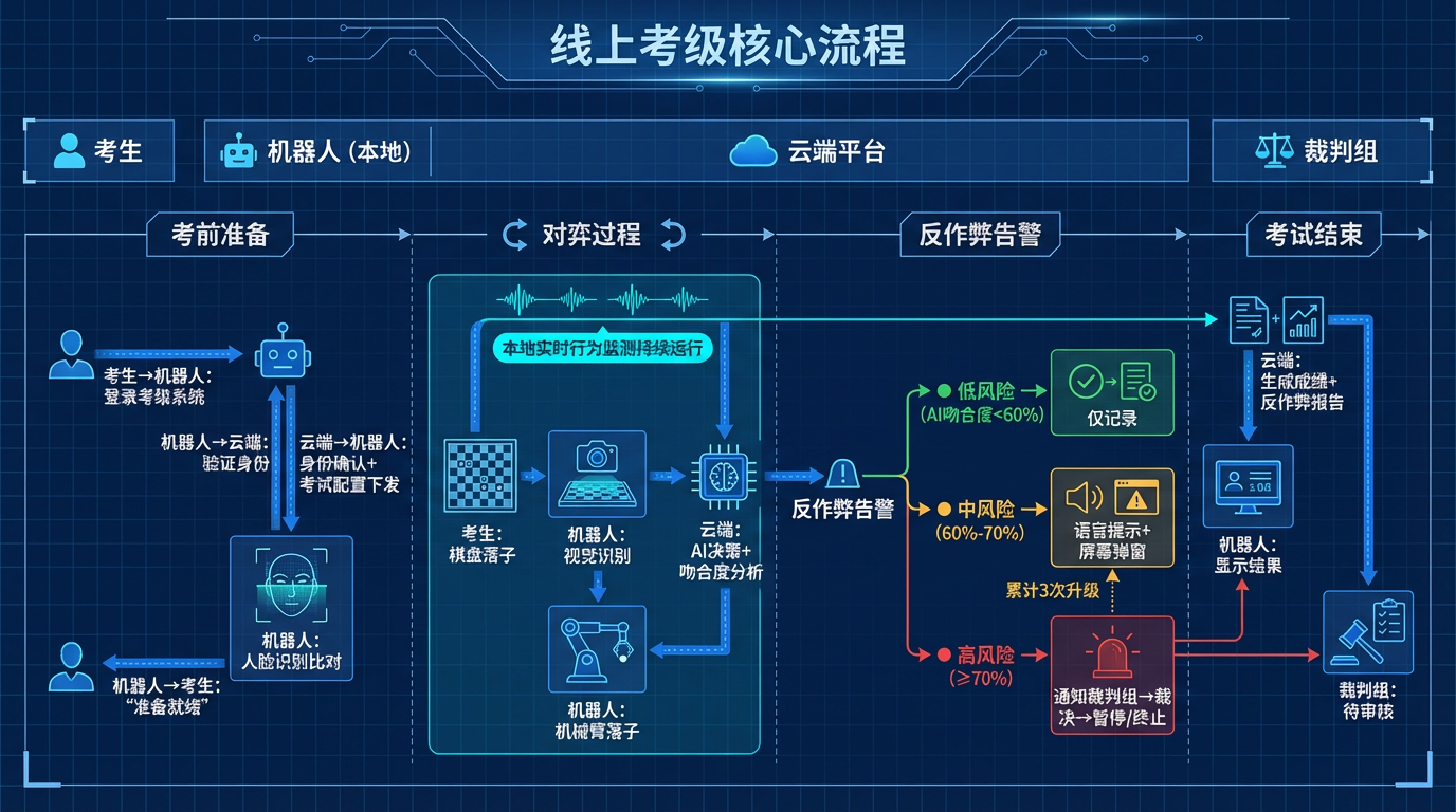 | P0 | 线上考级考段 | 用户通过机器人参加远程定级定段考试,全程防作弊监控 |