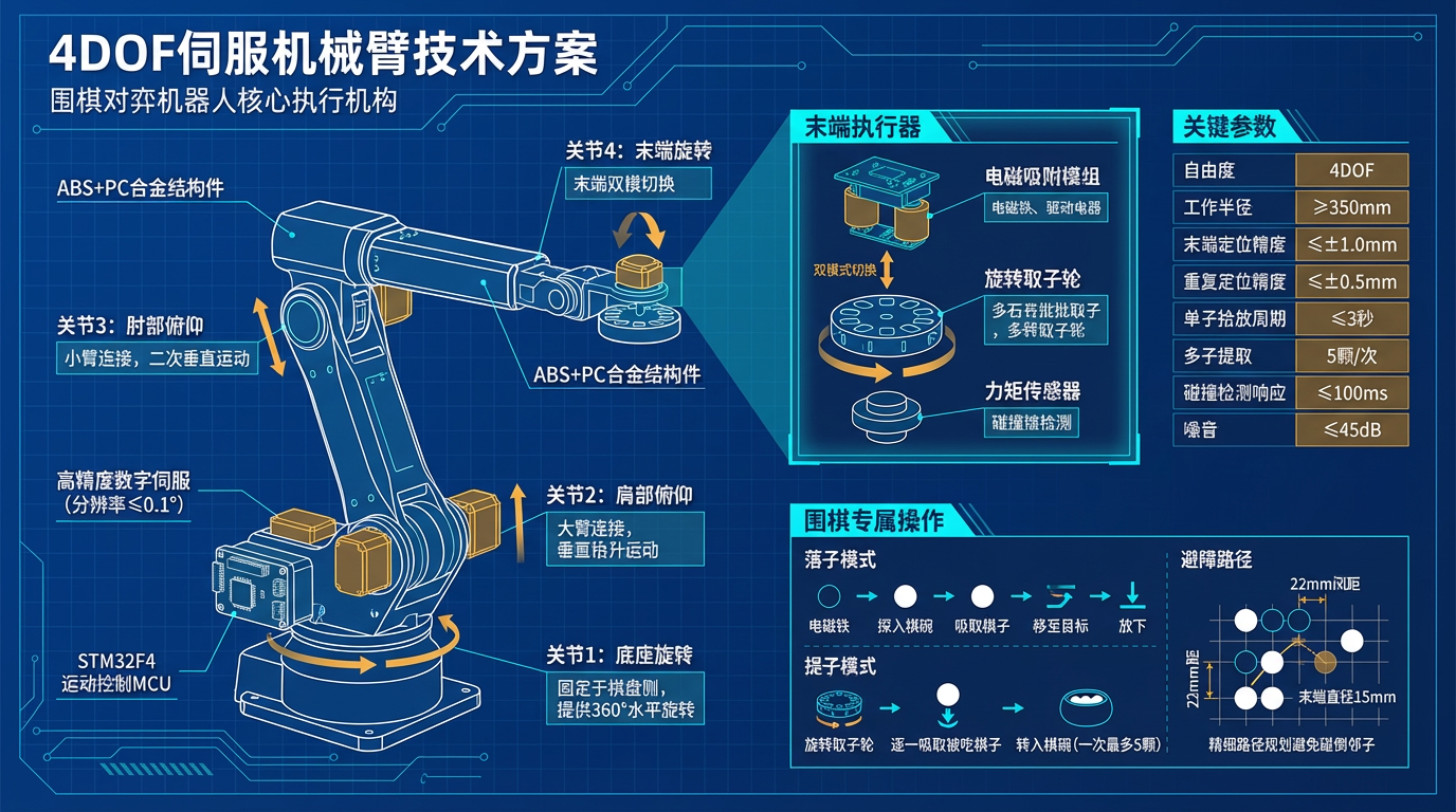 | 机械臂碰倒邻子 | 围棋子间距22mm较密 | 精细路径规划 + 末端夹持直径控制在15mm以内 |