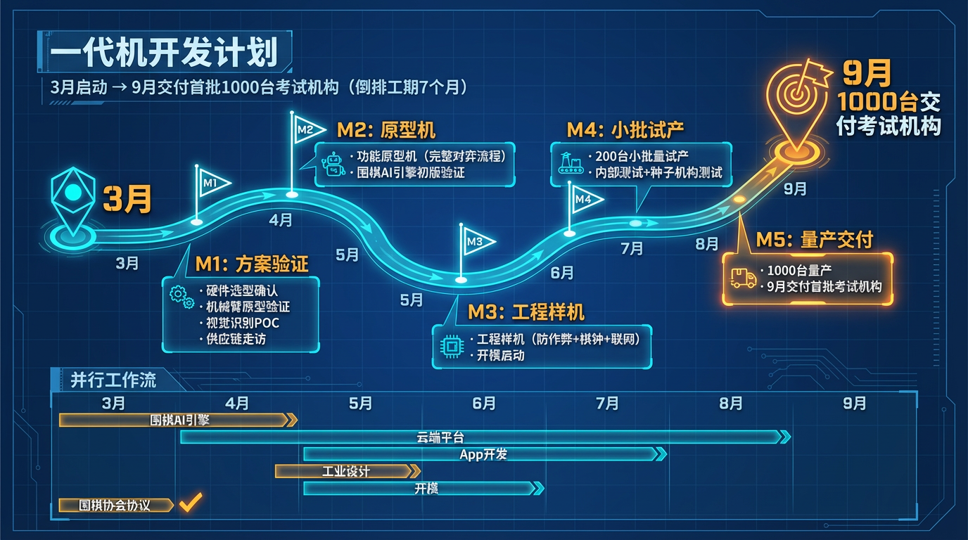 | M5: 量产交付 | 8-9月 | 1000台量产,9月交付首批考试机构 |